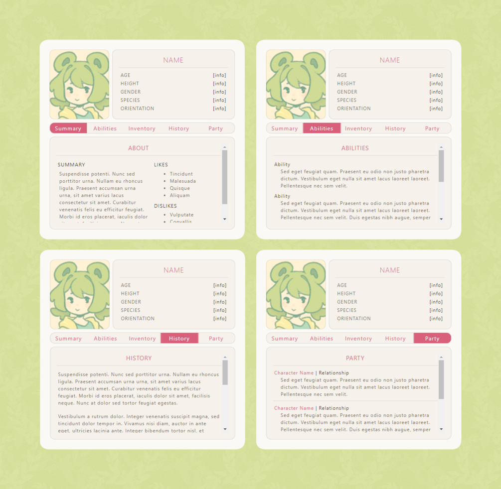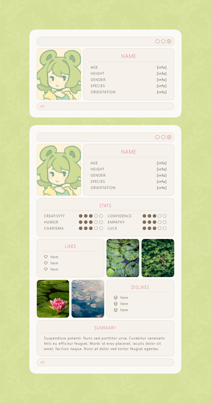 This HTML pack comes with 4 simple cards made for users and characters owo / Great for quick profiles!
